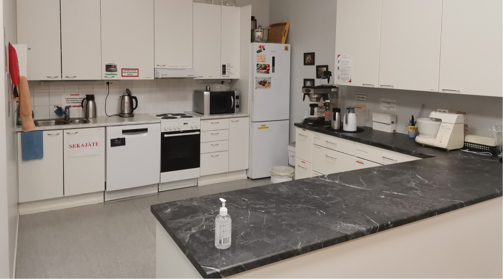 Tilojen varauksiin sisältyy myös keittiön käyttöoikeus. Keittiön varustukseen kuuluvat astiat, veden- ja kahvinkeitin sekä jääkaappi ja tiskikone.