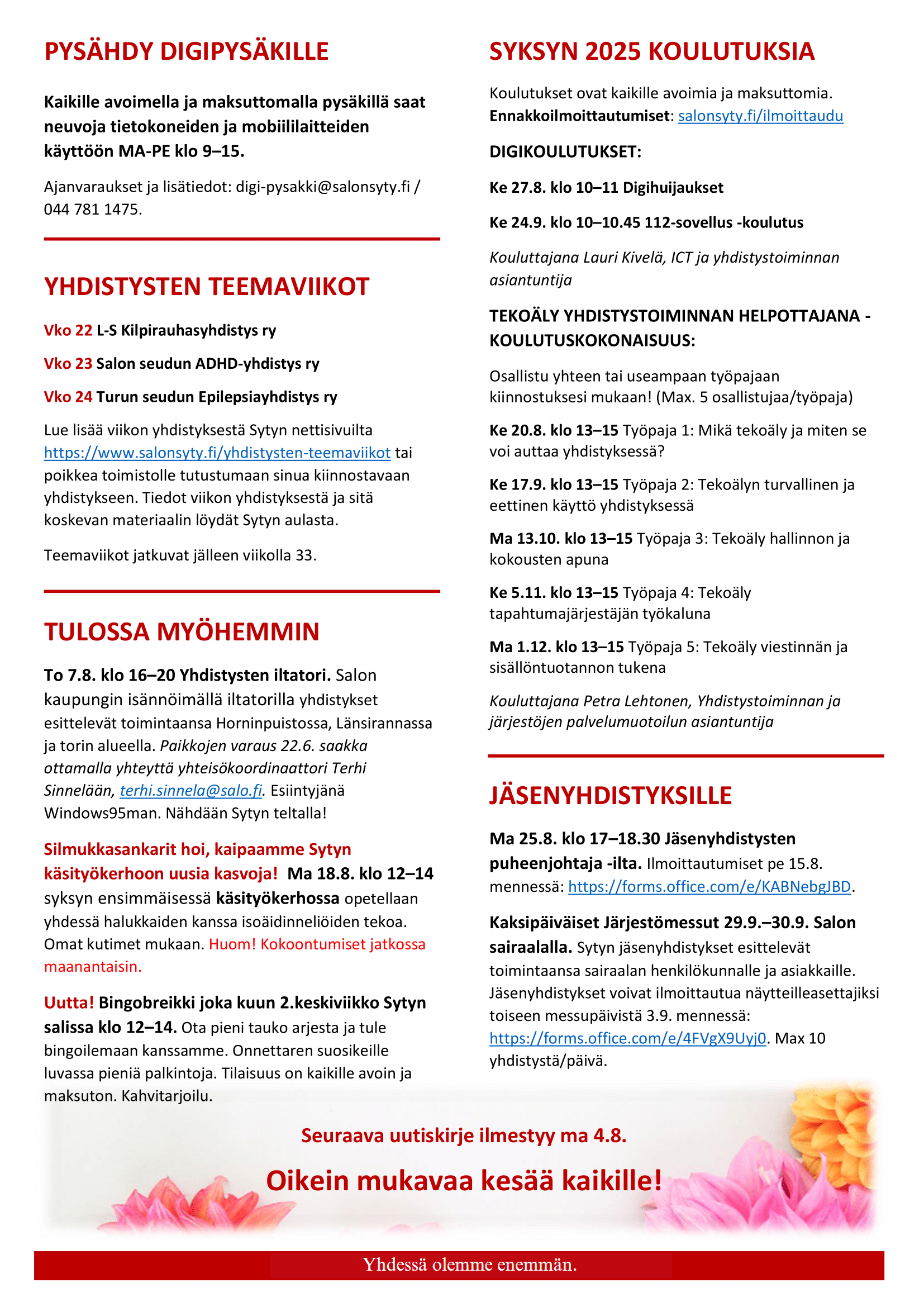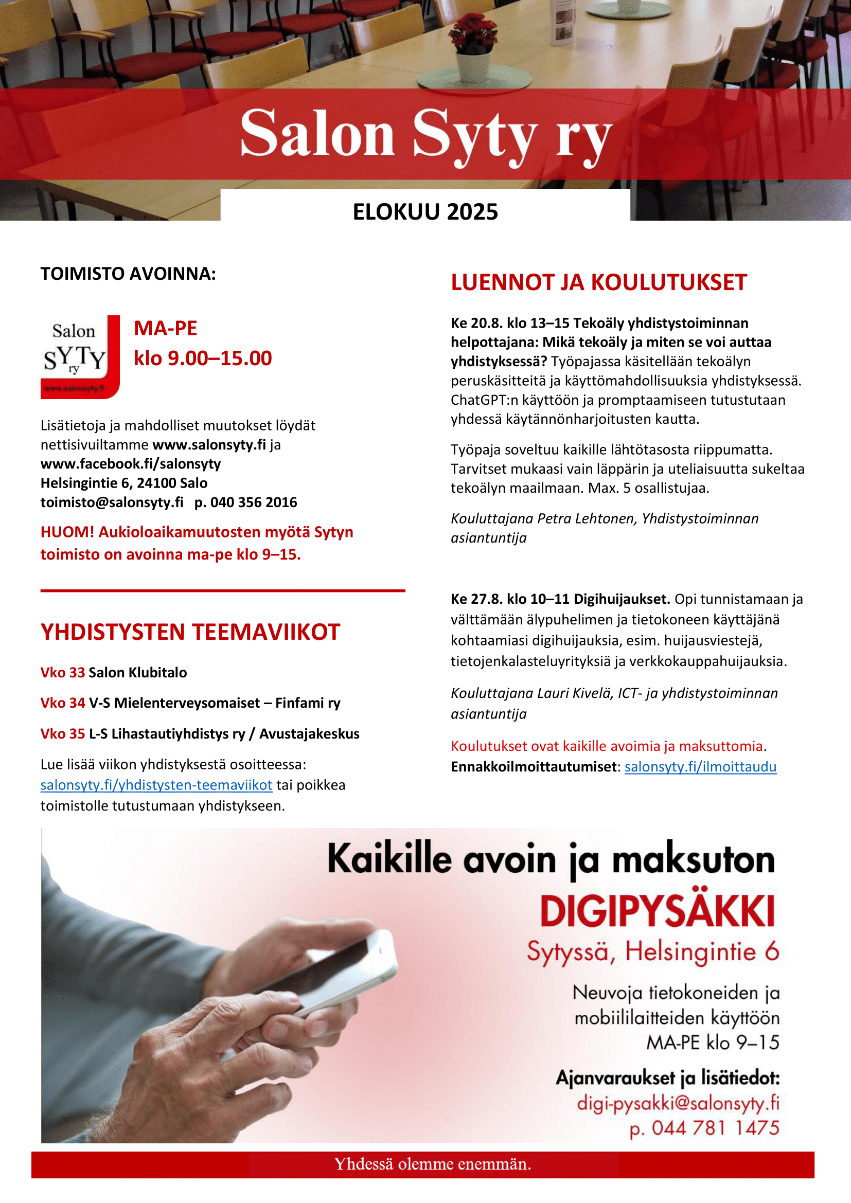 Salon SYTY ry kuukausitiedote ELOKUU 2019